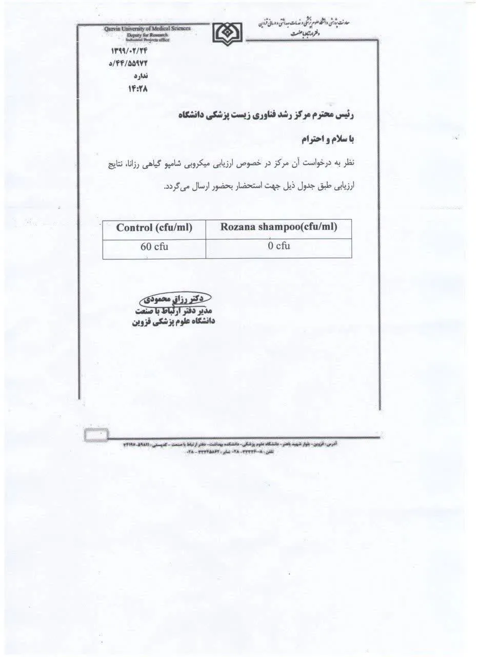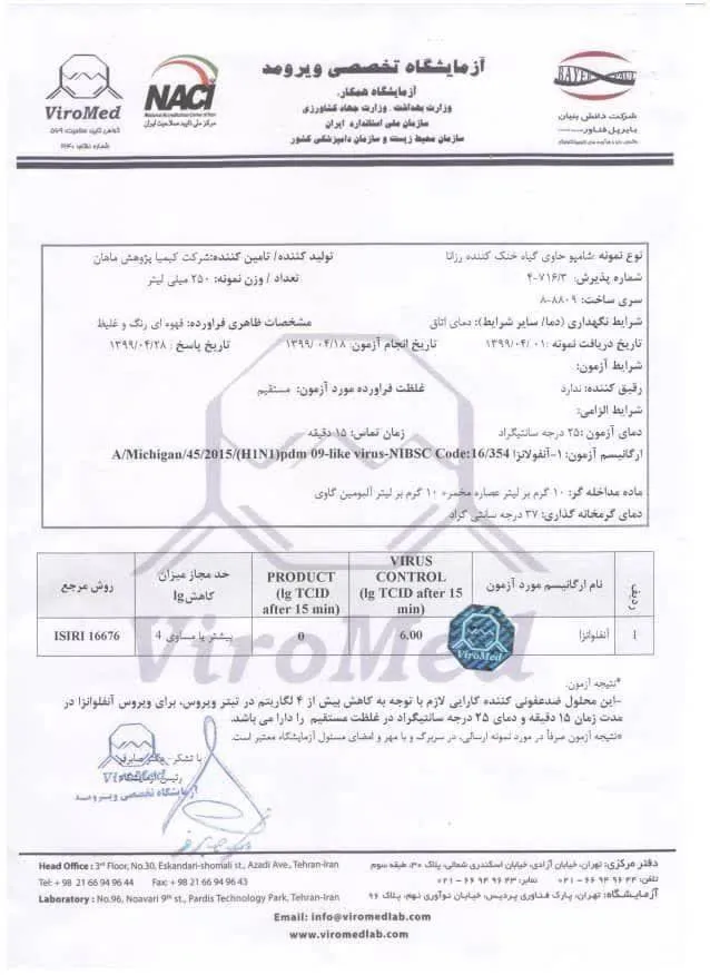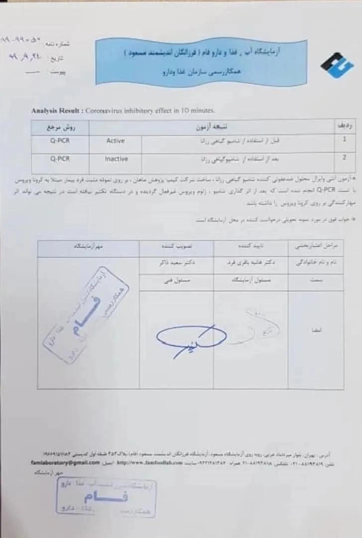 جوابیه آزمایشگاهی ، همکار رسمی سازمان غذا و دارو بابت اثبات ضدعفونی کننده بودن شامپو گیاهی رزانا بر روی تست مثبت کرونا